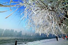 清晨,太阳初升,吉林市区的松花江两岸,大树枝条上都挂满了冰晶,人们起早来到江边观赏这场“雾凇”盛宴。我尝试着拍了几张大场景,行道树的形……