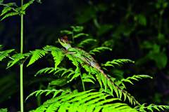 这身鲜艳的翠绿色,其实是无意中用闪光灯刺激到丽棘蜥,它因为紧张而表现出的警戒色,通常出现几秒钟后,如果你继续靠近,它就会落荒而逃了。平……