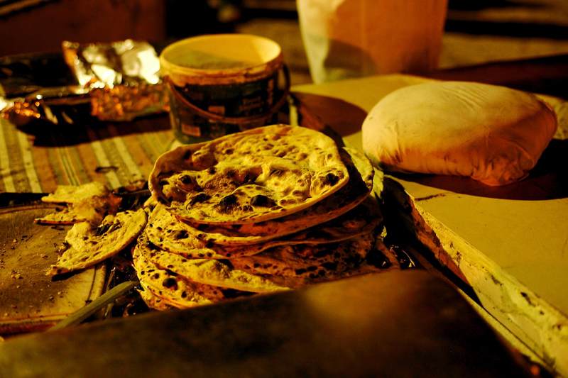盛宴之下,桌上很快就摆满了各式各样的阿拉伯菜肴。我最喜欢的烤羊肉串和切片烤肉,阿拉伯语叫起来很像“烤爸爸”(Kabab)和“想我了吗”(Shawalma),听起来就令人轻松开怀。特别是“烤爸爸”,只见羊肉被切成拇指见方的小块,再加入胡椒、盐、葱姜和油等佐料,然后串在长约1米的铁扦上放入烤炉,待肉色变得黄脆,出炉即食,极其美味。而阿拉伯大饼,则是由特制的炉子烘烤而成,很像新疆的馕,外脆内嫩,再蘸上当地的霍姆斯酱,就着酸黄瓜条和青菜吃,别有一番风味。