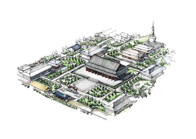 不同于大多数寺院坐北朝南的布局,西夏国寺山门向西而开。这是因为佛教典籍记载的释迦牟尼佛涅槃时面向西方而卧。最早塑于西夏的卧佛真实地模仿了这一场景,所以整个寺院也就相应地面向西方。绘图/王杰