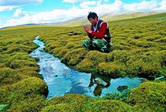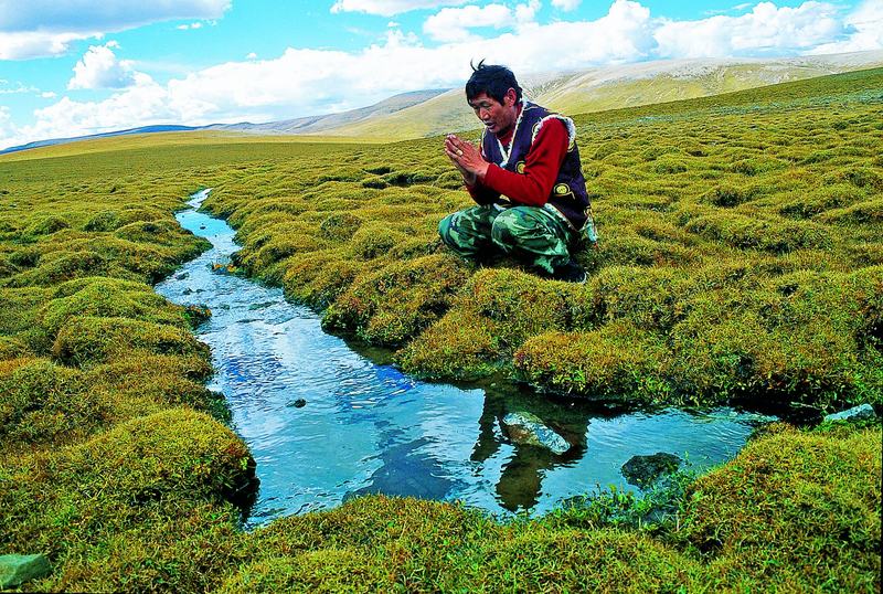 2008年9月,青海三江源头科学考察队判定当曲的源头且曲为真正的长江源,听到这个论断,随队的向导立刻面对着源头虔诚地诵起经来。摄影/刘少创
