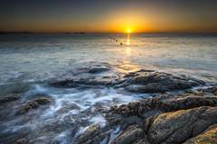 一日清晨,我走出宾馆的房间。突然发现此时已经退潮了。天空、人、海形成了一幅多么和谐画面。