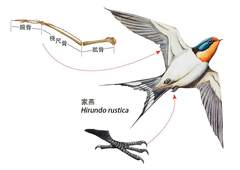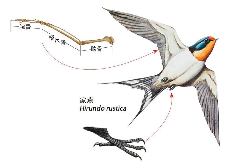 每逢夏季,北京雨燕和家燕都会在我国北方地区做巢繁殖。相比于雀形目的家燕,雨燕目的北京雨燕的腕骨修长,桡骨、尺骨及肱骨则相对较短。在腕骨外着生的一列飞羽名为初级飞羽,北京雨燕拥有十枚较长的初级飞羽,其翅膀狭长如镰刀,向内收起翅膀时,它们能够高速冲刺捕捉飞虫;而翅膀展开时,雨燕则可以节省体力地长距离滑翔。